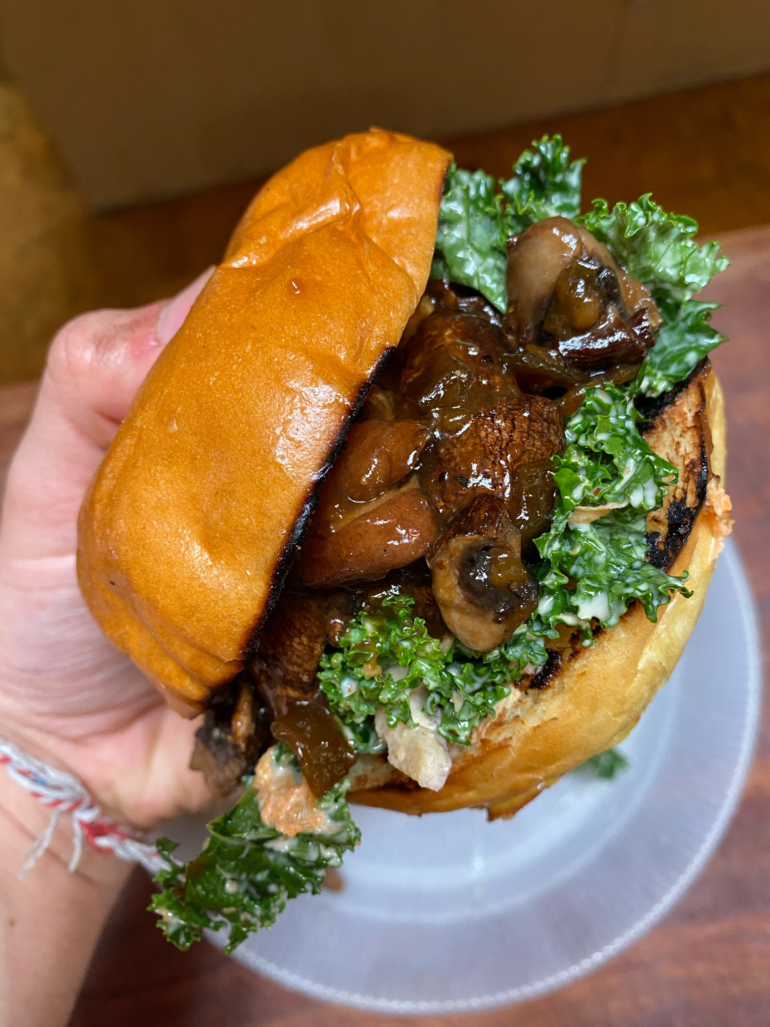 Smoked, grilled, sauteed, and sauced mushrooms are used instead of pork with a homemade burger bun and vegan kale slaw.